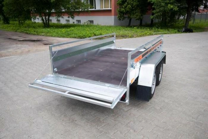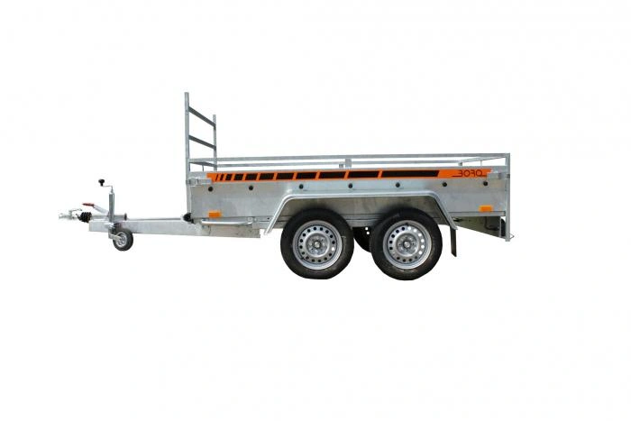 Gamme utilitaire-acier epais 2 essieux alko 750 kg plancher antidérapant chassis mécano-soudé-galvanisé à chaud ridelles fixes galvanisées à chaud ridelles 0. 36 + 0. 10 – barres d'arrimages et porte échelle de série