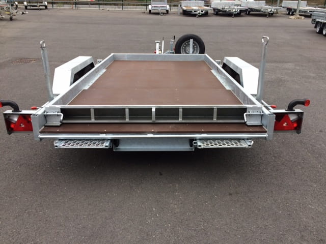 La remorque plateau pour petite voiture ou matériel à une garde au sol faible permettant ainsi de monter aisément tondeuses, motos ou petites voitures. Idéale pour les professionnels comme pour les particuliers ce plateau robuste avec un chassis méccano soudé renforcé galvanisé à chaud est muni d’un plancher en bouleau finlandais et d’essieu Alko.